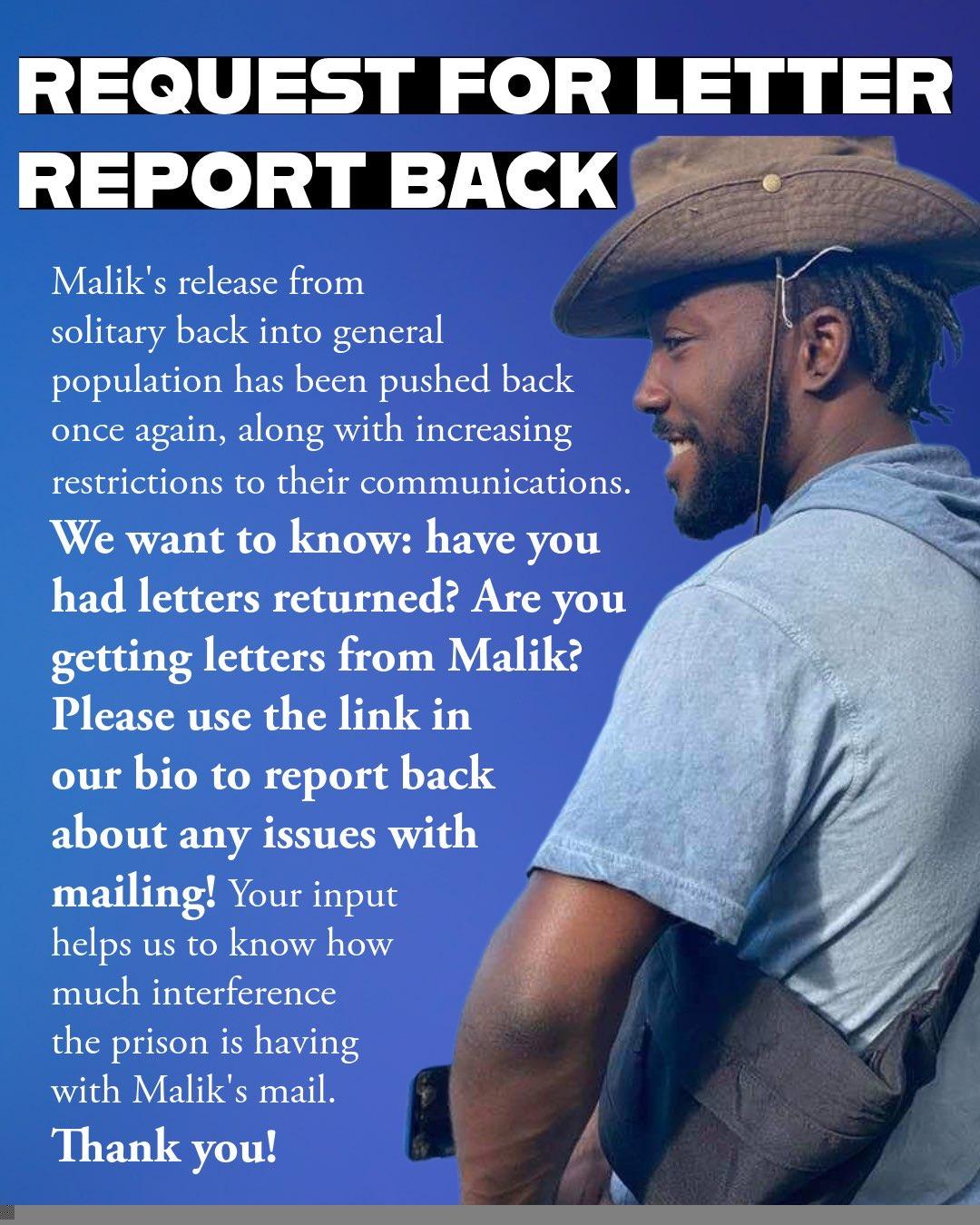 Are you experiencing issues with letters being returned? Have you been expecting letters from Malik, but haven’t gotten any? When you do get them, are they significantly delayed? Any info you have about your experience sending letters to Malik is helpful and appreciated! Your input allows us to know how much interference the prison is having with Malik’s mail.