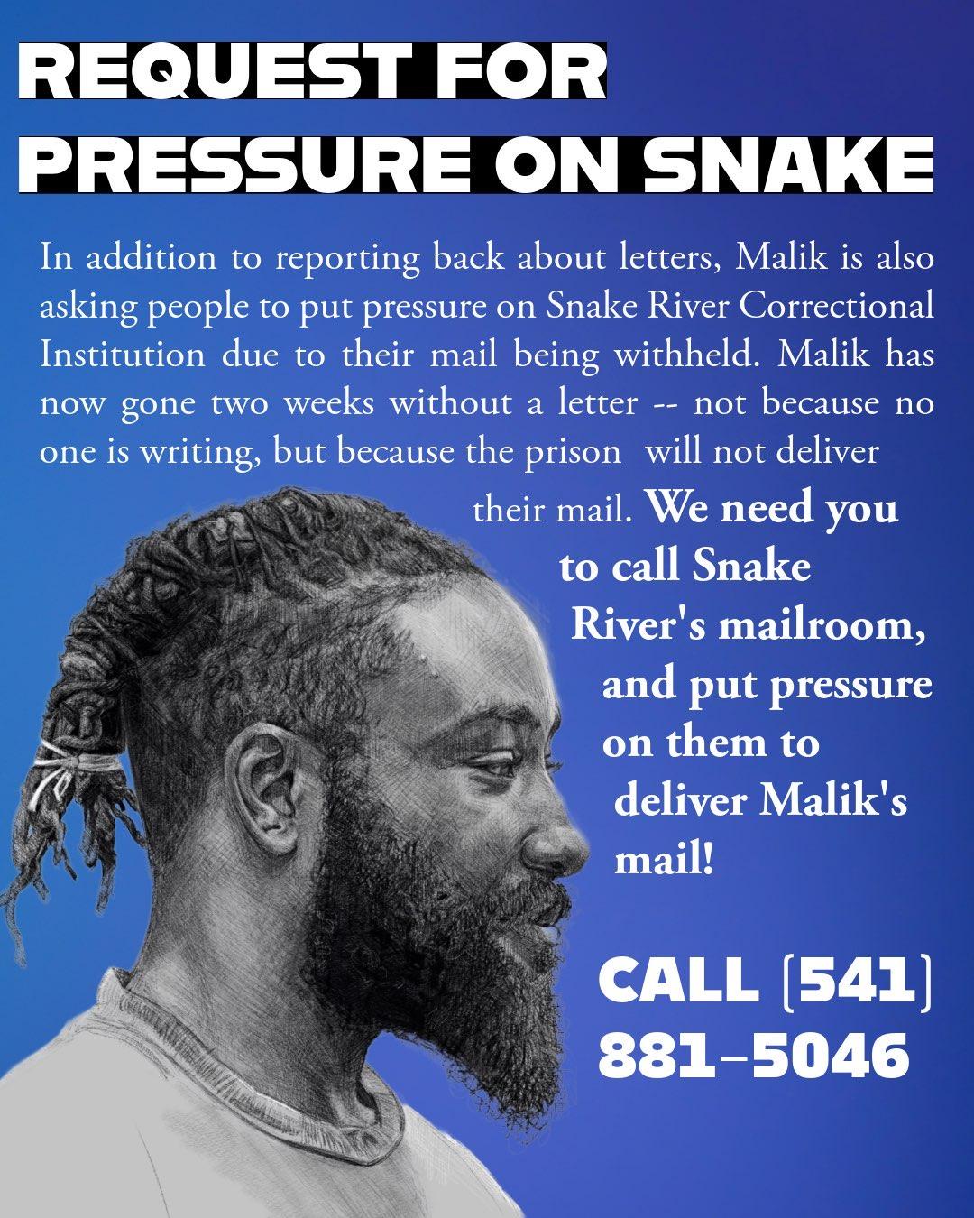 Additionally, Malik is requesting that people call in to put pressure on Snake River to deliver their mail. Any calls that you are able to make lets the mailroom know that they are not getting away with interfering with Malik’s mail, that we are noticing and care.